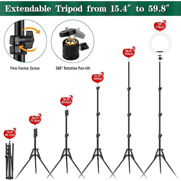 • Adjustable Floor Tripod & Desktop Stand – Our RGB led ring lamp comes with 2 tripod stands to meet your different height needs. The floor tripod stand is only 15.4” when fully folded, 59” length when you fully stretch it. Premium aluminum alloy material and sturdy triangular structure as supports, keeping balance and steady, avoiding the risk of tipping over.The small desk stand is only 7.9” when folded, portable and space-saving to put it into your handbag.