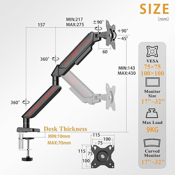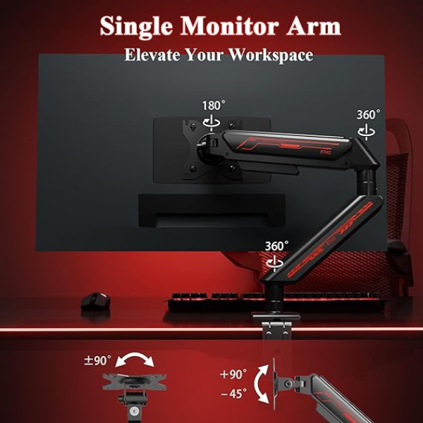 • [Full-motion PC Workstation] – This PC monitor arm offers 360° swivel (upper/lower arms), +90°/-45° tilt, 360° rotation, and height adjustment. Perfectly position screens for coding, design work, or streaming in ergonomic seated/standing setups