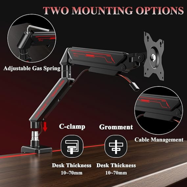 • [Two Mounting Options + One-year Surpport] – Install via C-clamp (10-70mm desk thickness) or grommet (10-70mm desk thickness and 9-20mm hole diameters) on this display arm. Hidden cable channels organize wires, while a 1-year warranty guarantees durable performance for home/office environments