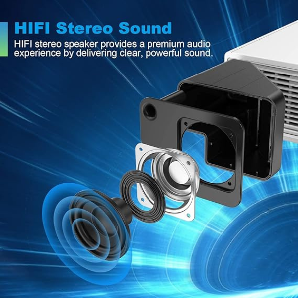 • 【Built-in Speakers and Fan】This portable video projector equipped advanced built-in speakers system, offering excellent loud sound quality without connecting external speaker. It also equipped with an innovative cooling system with heat dispersion, as well as a noise suppression technology which cuts fan sound in half. You can enjoy more watching experience with lower noise.