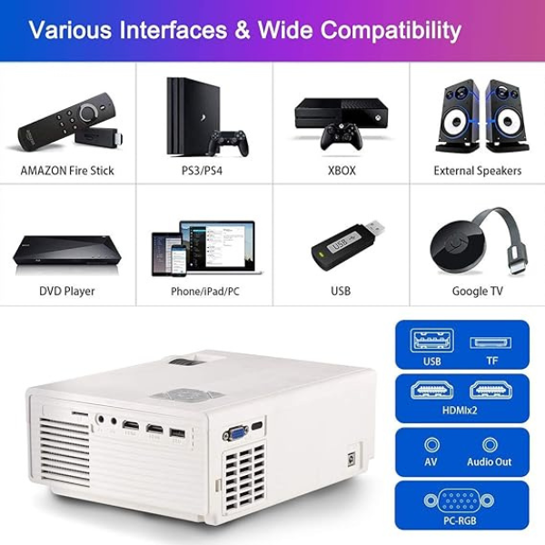 • 【MULTIPLE INPUTS】Our portable projector is easy to operate with many ports, including HDMI, VGA, USB, AV interfaces. Support wide range of multimedia connection with many devices such as laptop, digital cameras, DVD, XBOX / PS, PC, mobile hard drives, game console, and smartphones.