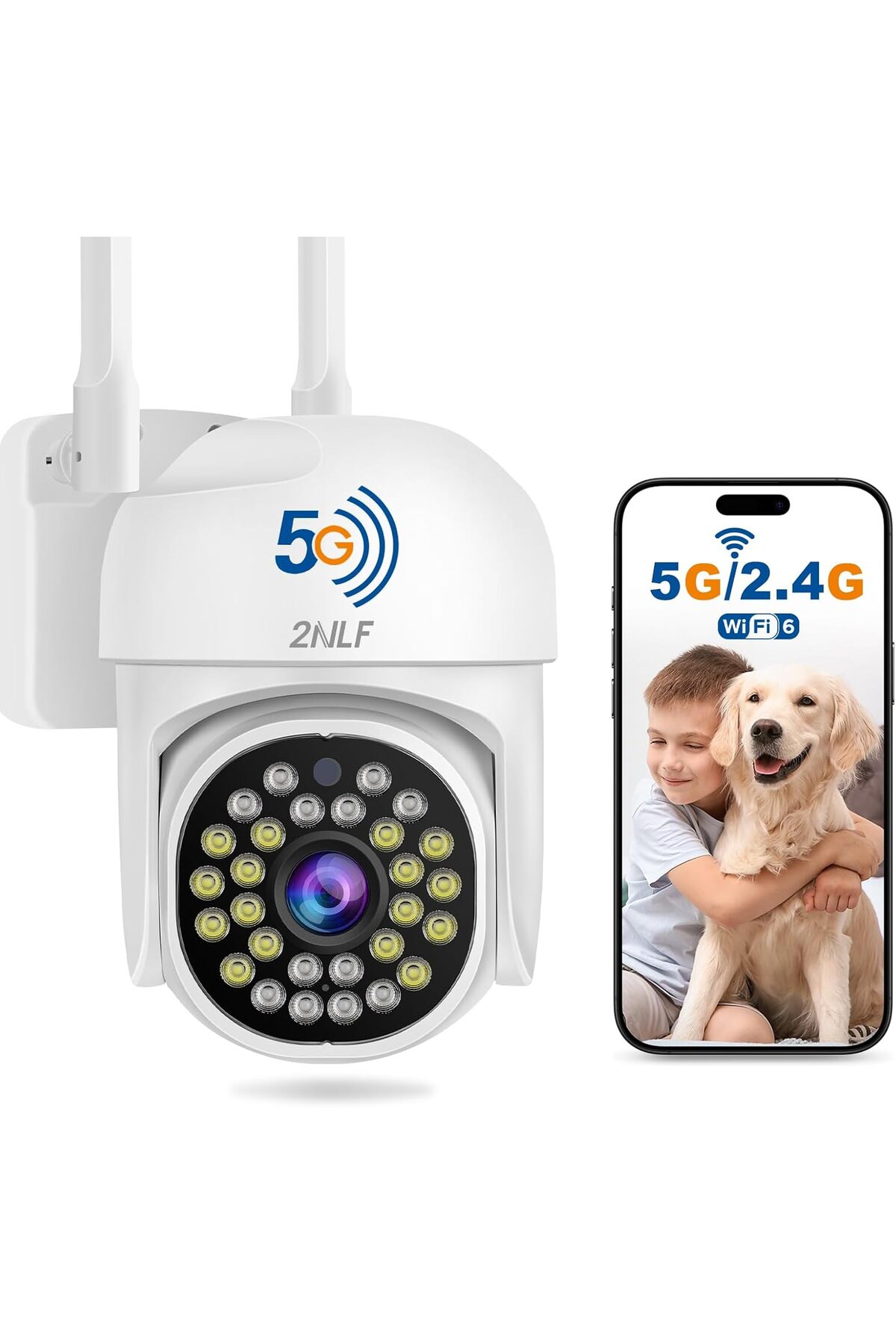 The 2NLF Outdoor Security Camera offers advanced surveillance features such as 1080P HD resolution, 360° pan-tilt-zoom (PTZ) control, motion detection with auto-tracking, color night vision, two-way audio, and dual Wi-Fi connectivity (5GHz & 2.4GHz).