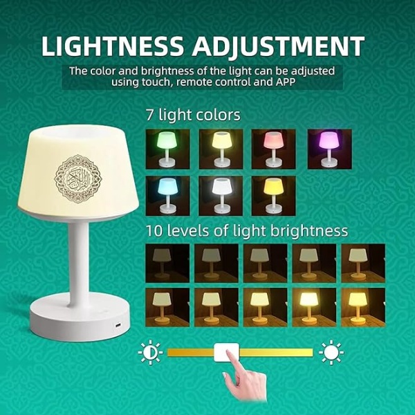 • Colorful Lamp Options: Customizable color options for the desk lamp create the desired ambiance in your space. Access the complete Quran with 30 Juz and recitations by 16 different reciters in various languages.