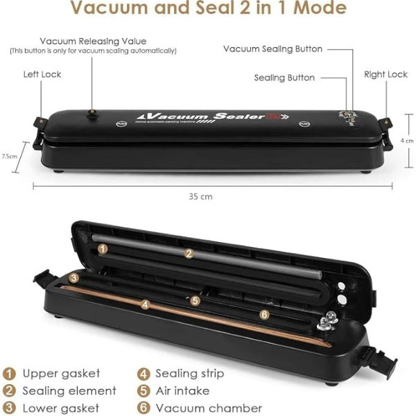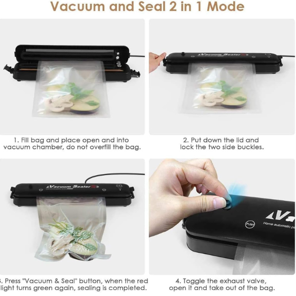 • Automatic Sealing: The machine features automatic sealing functionality, making it effortless to vacuum seal your food items with just the push of a button. This ensures a perfect seal every time, maximizing freshness and preventing spoilage