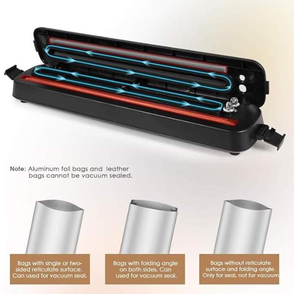 • Food Vacuum Air Sealing System: The vacuum air sealing system effectively removes air from the bags, creating an airtight seal that locks in freshness and flavor while preventing freezer burn and food wastage.