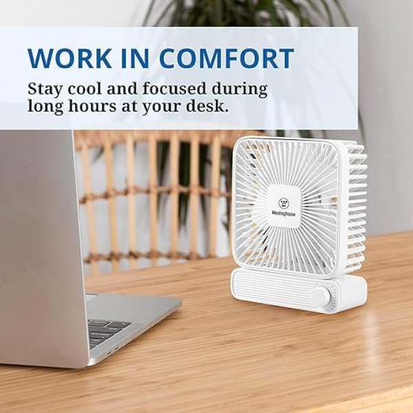 Westinghouse Rechargeable Table Fan with Adjustable Speed Control Knob – Compact Square Design, Silent Operation, USB Powered, Portable Mini Fan for Desk, Office & Travel